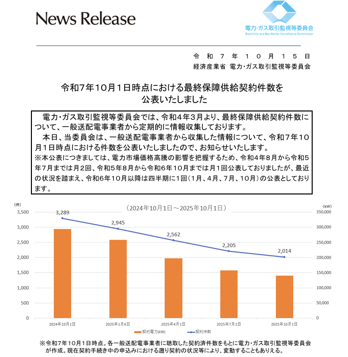 「令和7年10月1日時点における最終保障供給契約件数を公表しました」(2025年10月15日)