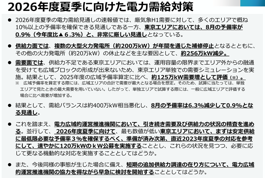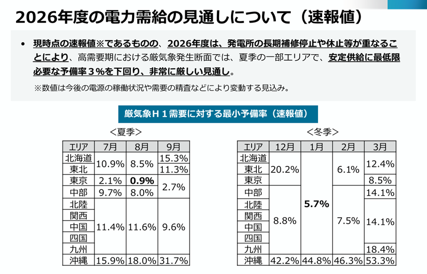 「2026年度は、発電所の長期補修停止や休止等が重なることにより、夏季の一部エリアで安定供給に必要な予備率3%を下回り、非常に厳しい見通し。」東京エリアでは7月2.1% → 8月0.9% → 9月2.7%と、真夏の8月に極端な需給逼迫が予測されています。