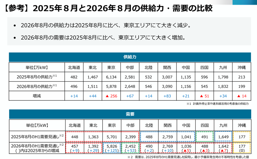 経産省資料では、複数の大型火力発電所(約200万kW)とその他火力(約50万kW)の休止が主要因と分析。その結果、東京エリアの供給力は前年(2025年)比で256万kW減少。