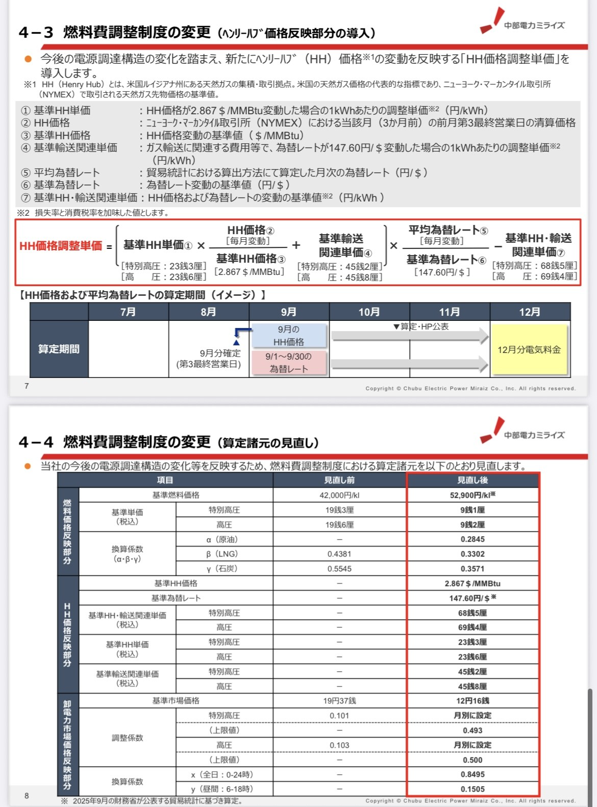 公表資料の赤枠部分の通り、基準燃料価格・基準HH単価・基準輸送費・基準為替レートなど、算定元の多くが全面改定されました。