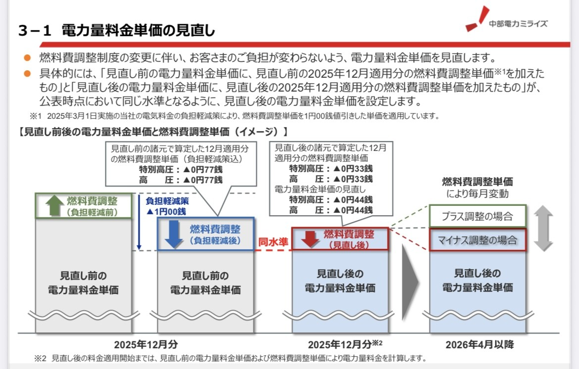 今回、中部電力ミライズは「燃料費調整制度の変更」を受けて、電力量料金単価そのものを見直すと発表しました。