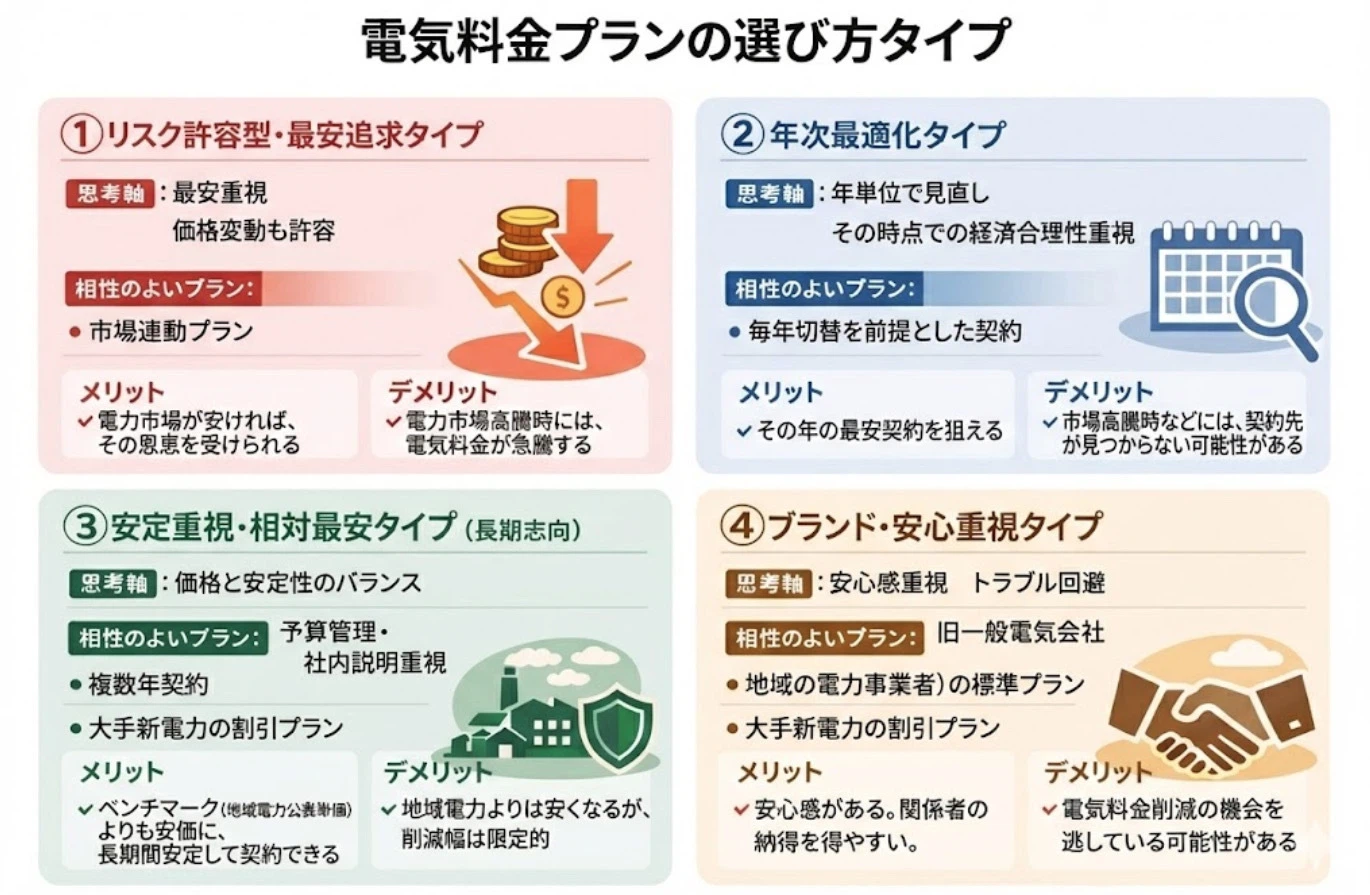 このように、現場主義を続けてきたところ、私は、企業によって電力契約の選び方には、特徴があることに気づきました。