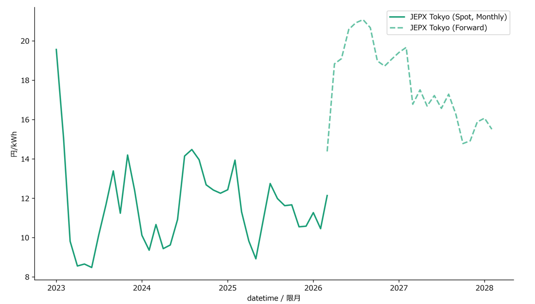 これまでは半年程度で価格が落ち着くとの見方もありましたが、現在は1年以上にわたり20円/kWh前後の水準が継続する形で形成されています。