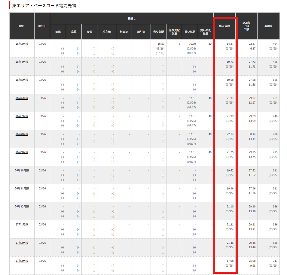 ▼TOCOM東エリアベースロード電力先物価格(3月25日時点)