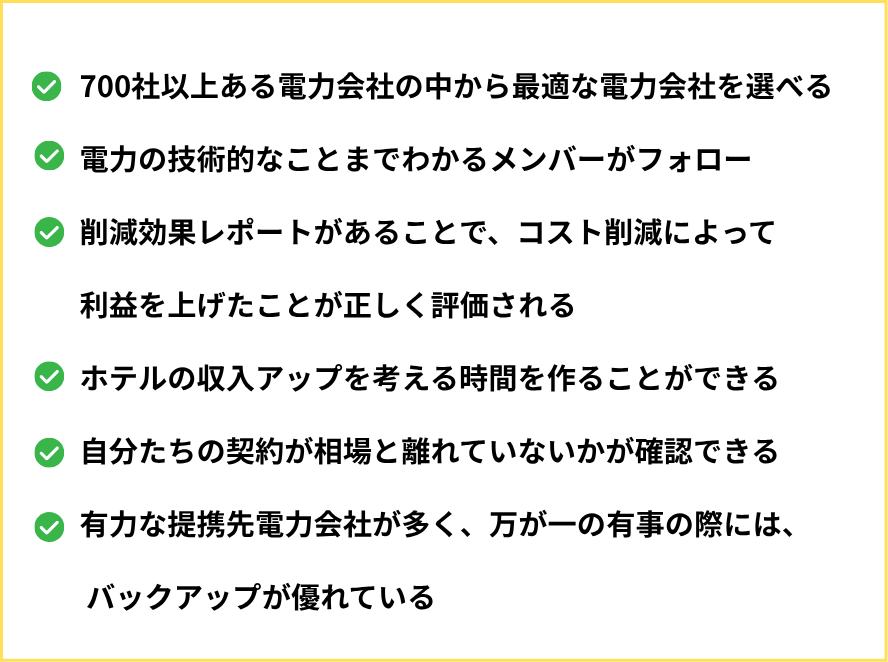 私たち日本電力調達ソリューションは、ホテルの電力コスト削減を見える化し、継続的にサポートする仕組みを提供しています