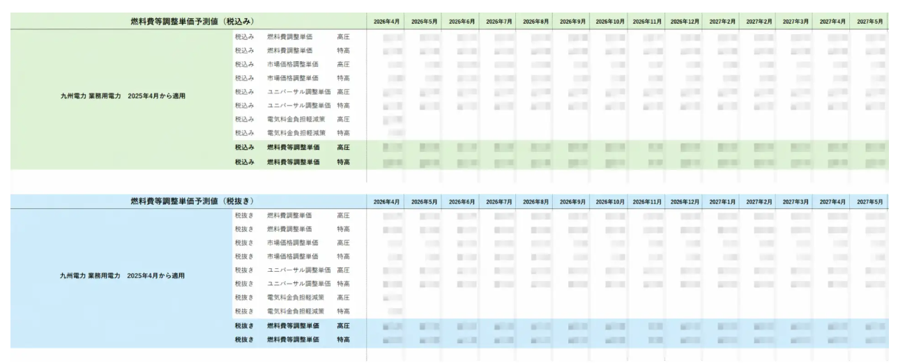社内説明や予算策定にそのまま活用可能な形式で、燃料費等調整額の予測値を提供