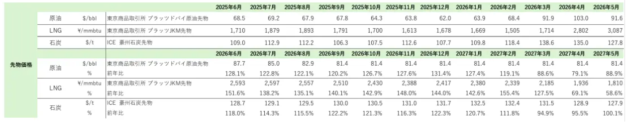 本サービスでは、各種エネルギー先物価格をベースに、輸送コスト(運賃)、価格反映までのタイムラグ、長期契約と短期契約の構成比(ブレンド)などを考慮し、燃料費等調整額の将来見通しを算出いたします。